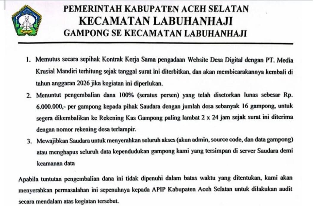 LENSAPOST.NET-16 gampong di Kecamatan Labuhanhaji, Kabupaten Aceh Selatan, mendesak PT Media Krusial Mandiri mengembalikan dana desa senilai Rp96 juta. Desakan itu muncul setelah kontrak pengadaan website desa diputus, karena pekerjaan tak selesai hingga akhir Tahun Anggaran 2025, meski pembayaran telah dilakukan penuh.