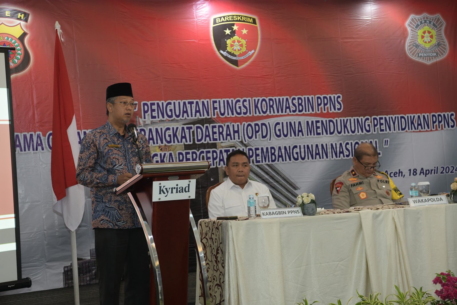 LENSAPOST.NET – Asisten Administrasi Umum Sekda Aceh Iskandar AP mewakili Pj. Gubernur Aceh membuka Kegiatan Pembinaan Peningkatan Kemampuan Bagi Penyidik Polri Pengemban Fungsi Korwas dan PPNS Dinas/Instansi Pemerintahan Tingkat Provinsi Aceh serta Kasat Pol PP Tingkat Provinsi dan Kabupaten/Kota seAceh, Kamis 18 April 2024, di Hotel Kyriad Muraya.