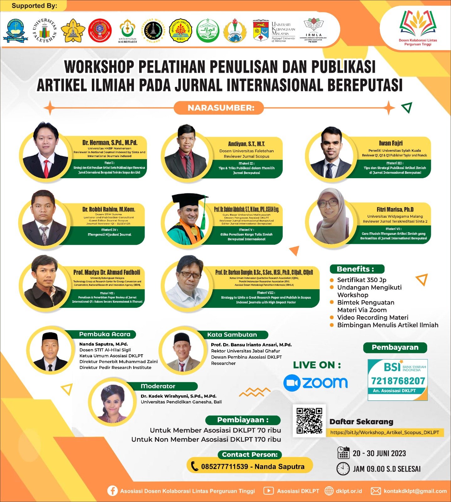 Flyer pelatihan penulisan dan publikasi artikel ilmiah pada jurnal internasional bereputasi selama 8 hari mulai Selasa tanggal 20-27 Juni 2023. Acara digelar secara daring melalui platform Zoom Meeting.