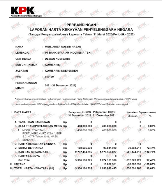 Di tengah sorotan terhadap kiprahnya, data Laporan Harta Kekayaan Penyelenggara Negara (LHKPN) mengungkap adanya lonjakan signifikan kekayaan Arief saat masih menjabat sebagai Komisaris Independen BSI Tbk.