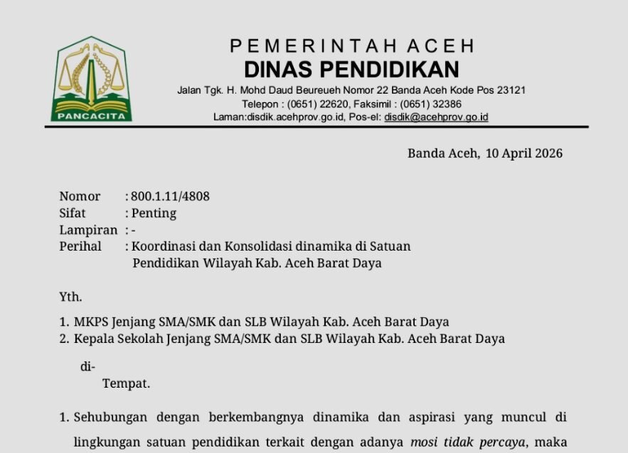 Berdasarkan surat Dinas Pendidikan Aceh Nomor: 800.1.11/4808 tertanggal 10 April 2026 yang bersifat penting, pemanggilan itu dilakukan dalam rangka koordinasi dan konsolidasi terkait dinamika yang terjadi di satuan pendidikan di wilayah Kabupaten Aceh Barat Daya.