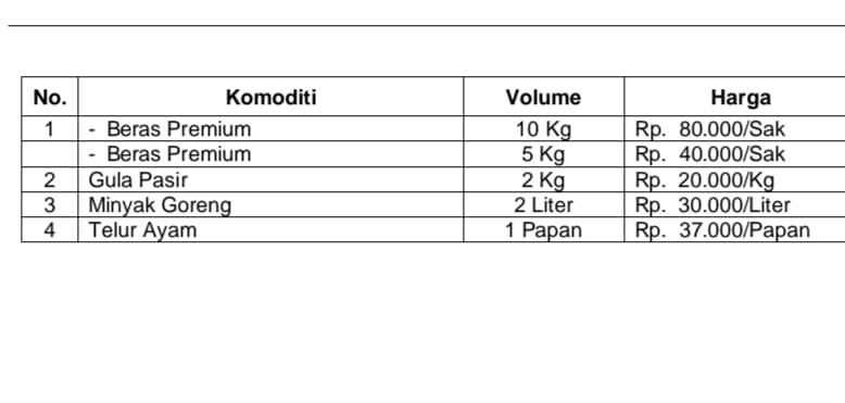 Dalam pasar murah tersebut, tersedia beras premium 10 kg dengan harga Rp80 ribu per zak, beras premium 5 kg Rp40 ribu per zak, gula pasir 2 kg Rp20 ribu per kilo, minyak goreng 2 liter Rp30 ribu per liter, dan telur satu papan Rp37 ribu per papan.