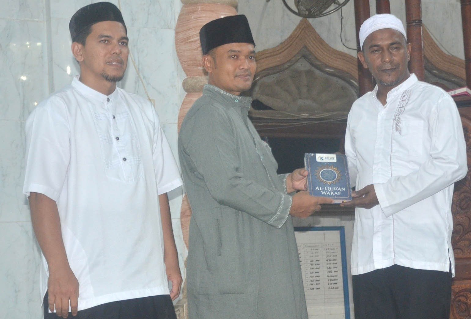 SERAH ALQUR’AN: Dirda LPPSDM BKPRMI Aceh Timur, Tgk Afandi, S.Pd.I, M.Ag, menyerahkan Alqur’an disela-sela Safari Ramadan DPD BKPRMI Aceh Timur ke Masjid Baitul Hidayah Alue Ie Mirah – Indra Makmu, Minggu (2/4) malam. Foto Dok. BKPRMI Aceh Timur.