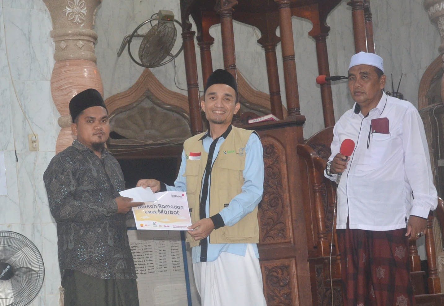 SERAH ALQUR’AN: Dirda LPPSDM BKPRMI Aceh Timur, Tgk Afandi, S.Pd.I, M.Ag, menyerahkan Alqur’an disela-sela Safari Ramadan DPD BKPRMI Aceh Timur ke Masjid Baitul Hidayah Alue Ie Mirah – Indra Makmu, Minggu (2/4) malam. Foto Dok. BKPRMI Aceh Timur.