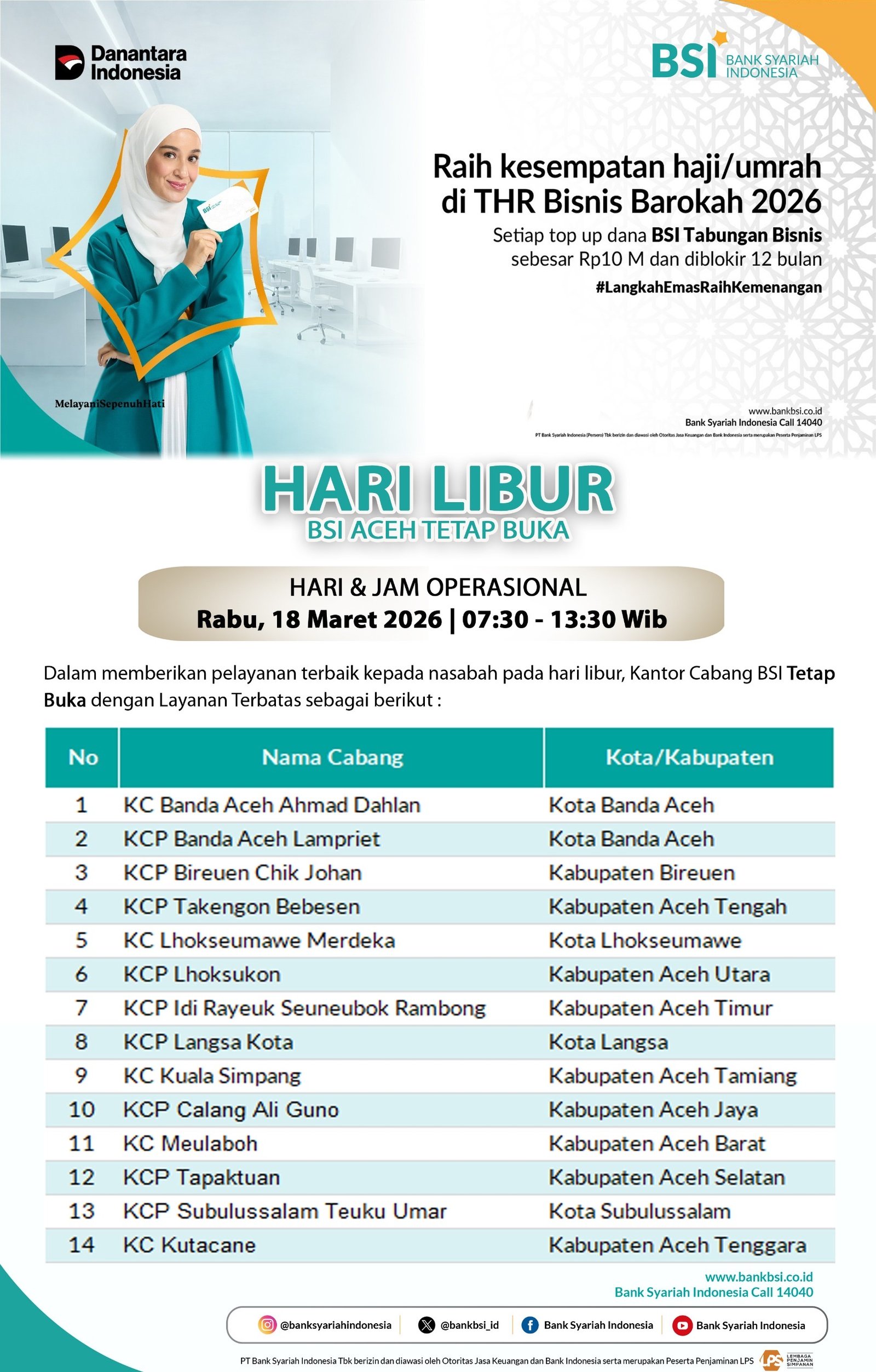 LENSAPOST.NET — Dalam rangka memberikan pelayanan optimal kepada masyarakat pada momen libur panjang Idul Fitri 1447 H, Bank Syariah Indonesia (BSI) Regional Aceh memastikan tetap membuka layanan operasional terbatas di sejumlah outlet.