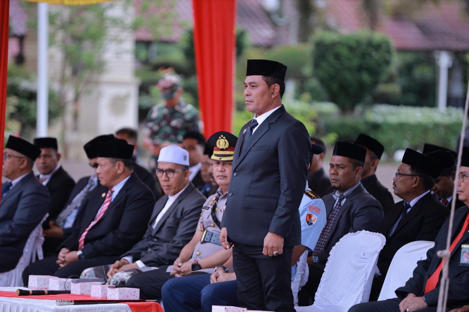 Bupati Aceh Besar, Muharram Idris menjadi inspektur upacara saat memperingati Hari Jadi Kota Jantho Ke-41 sekaligus Hari Pendidikan Nasional tahun 2025 di Halaman Kantor Bupati Aceh Besar, Kota Jantho, Senin (05/05/2025). FOTO/PROKOPIM PEMKAB ACEH BESAR