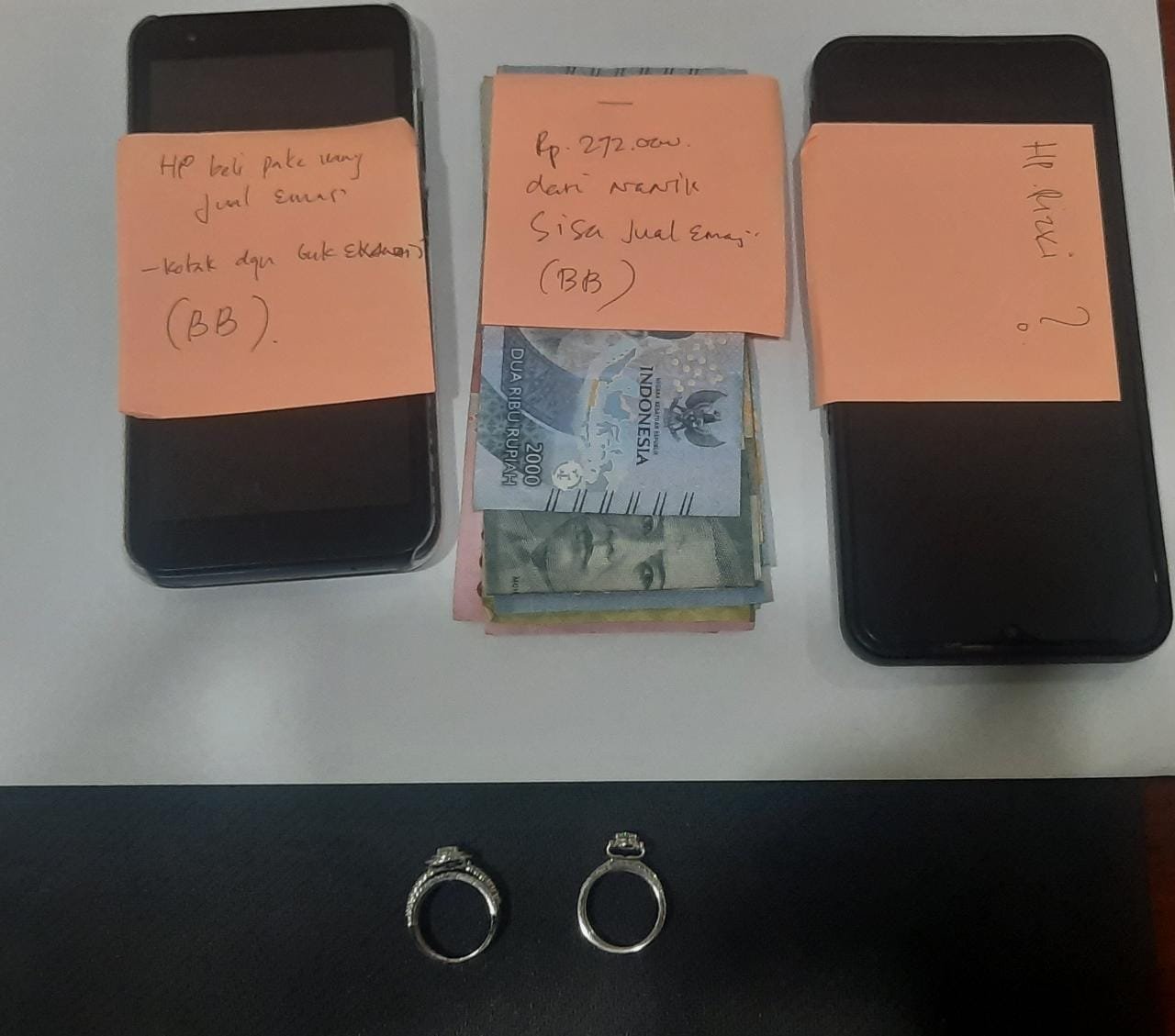 Dari tangan pelaku, barang bukti yang diamankan berupa uang tunai sebesar Rp.272 ribu, dua untai cincin emas putih dan satu unit HP merk Itel A27 warna biru.