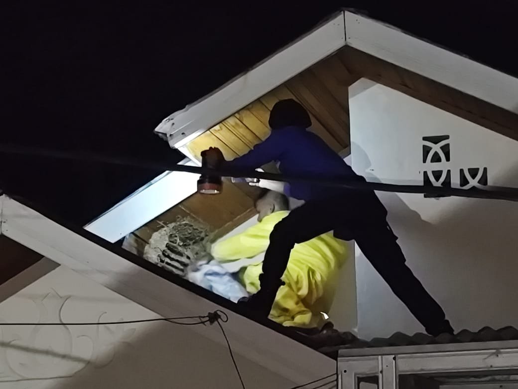LENSAPOST.NET – Personel Pemadam Kebakaran Pos Peukan Bada, Badan Penanggulangan Bencana Daerah (BPBD) Aceh Besar, mengevakuasi sarang tawon yang bersarang di plafon teras rumah warga di Komplek Perumahan Samaritan, Dusun Mata Ie, Gampong Leu Ue, Kecamatan Darul Imarah, Aceh Besar, Rabu (21/01/2026) malam.