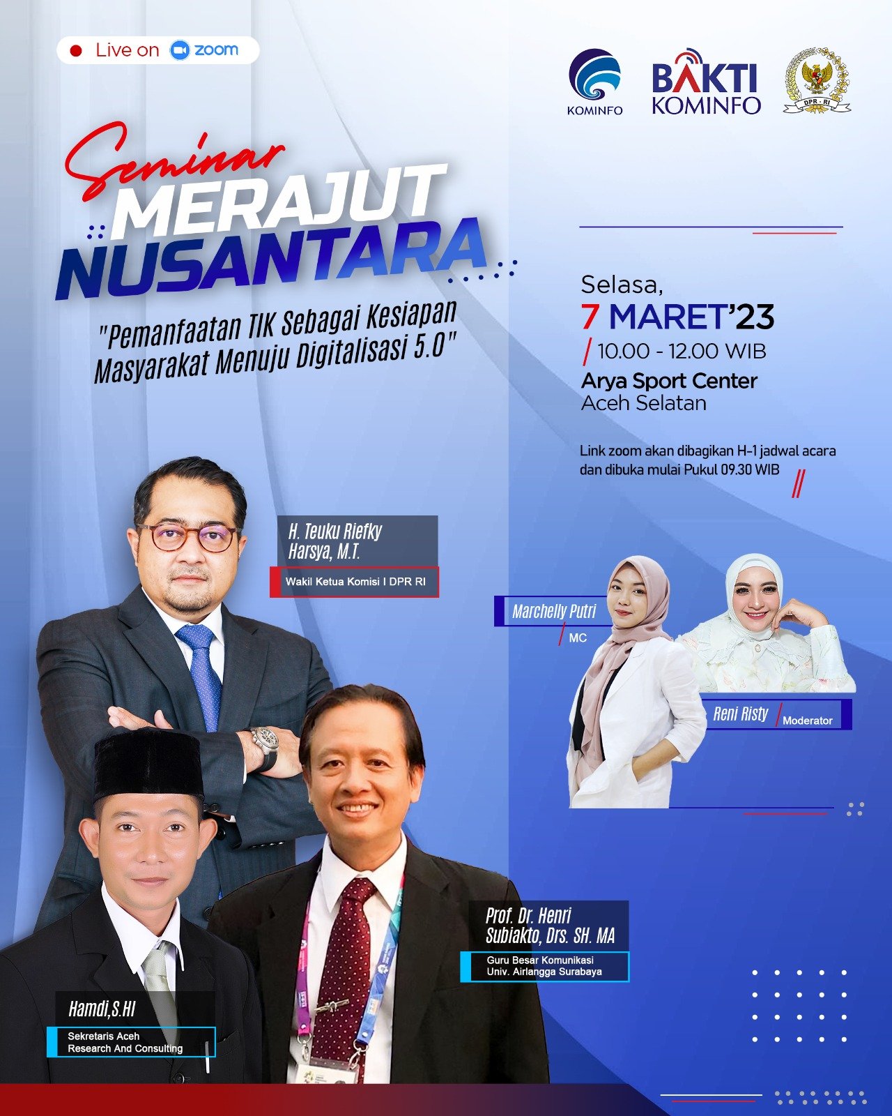 Hal ini disampaikan Wakil Ketua Komisi I DPR-RI, H Teuku Riefky Harsya MT pada pembukaan Webinar BAKTI “Pemanfaatan TIK Sebagai Kesiapan Masyarakat Menuju Digitalisasi 5.0” yang berlangsung di Arya Sport Center Aceh Selatan, Selasa 7 Maret 2023.