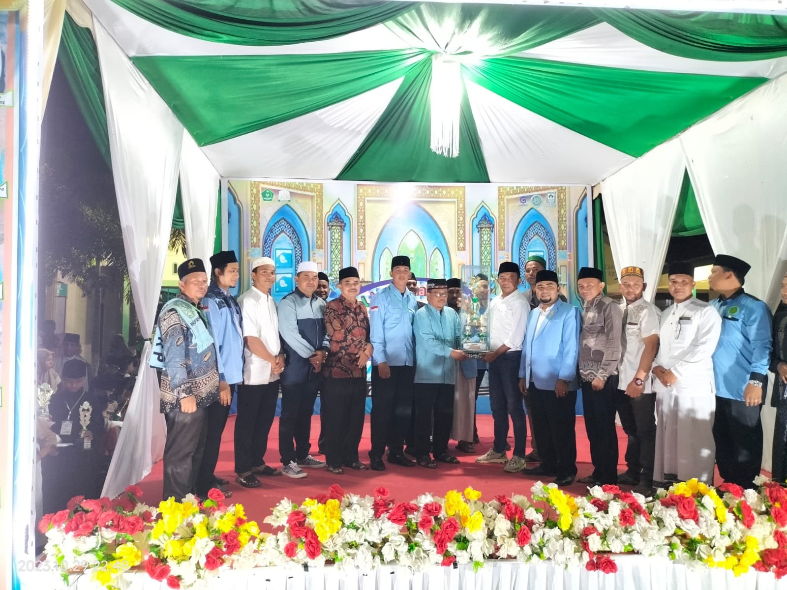 JUARA UMUM: Ketua DPRK Aceh Timur, Fattah Fikri, menyerahkan tropi juara umum FASI V BKPRMI Aceh Timur 2023 di Komplek Masjid Agung Darussalihin Idi, Minggu (29/10) malam. Foto Humas BKPRMI Aceh Timur