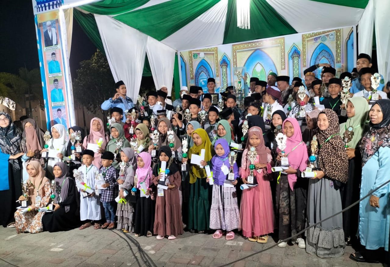 PEMENANG FASI: Para santri sebagai pemenang FASI berfoto usai penutupan FASI V BKPRMI Aceh Timur di Komplek Masjid Agung Darussalihin Idi, Minggu (29/10). Waspada/H. Muhammad Ishak