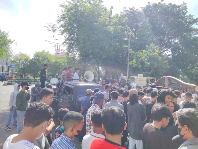 “Rapatkan barisan, kawan – kawan,”sorak orator Aksi di depan pagar Gedung DPR Aceh, Rabu 5 Juli 2023.