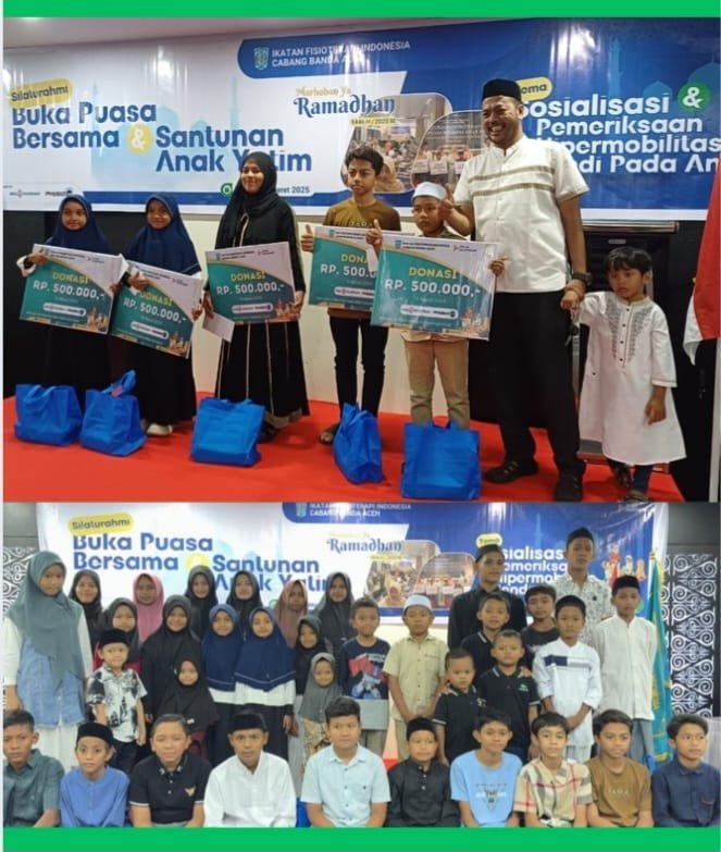 LENSAPOST.NET- Ikatan Fisioterapi Indonesia (IFI) Cabang Banda Aceh menggelar buka bersama dengan 35 orang anak yatim dari Banda Aceh dan Aceh Besar, Sabtu, 15 Maret 2025 di Hotel Rasamala Indah Banda Aceh. Dalam acara tersebut, juga diisi dengan penyuluhan kesehatan dengan tema “Sosialisasi dan Pemeriksaan Hipermobilitas Sendi Pada Anak yang dipaparkan oleh Ftr. Humaira, SSt. FT