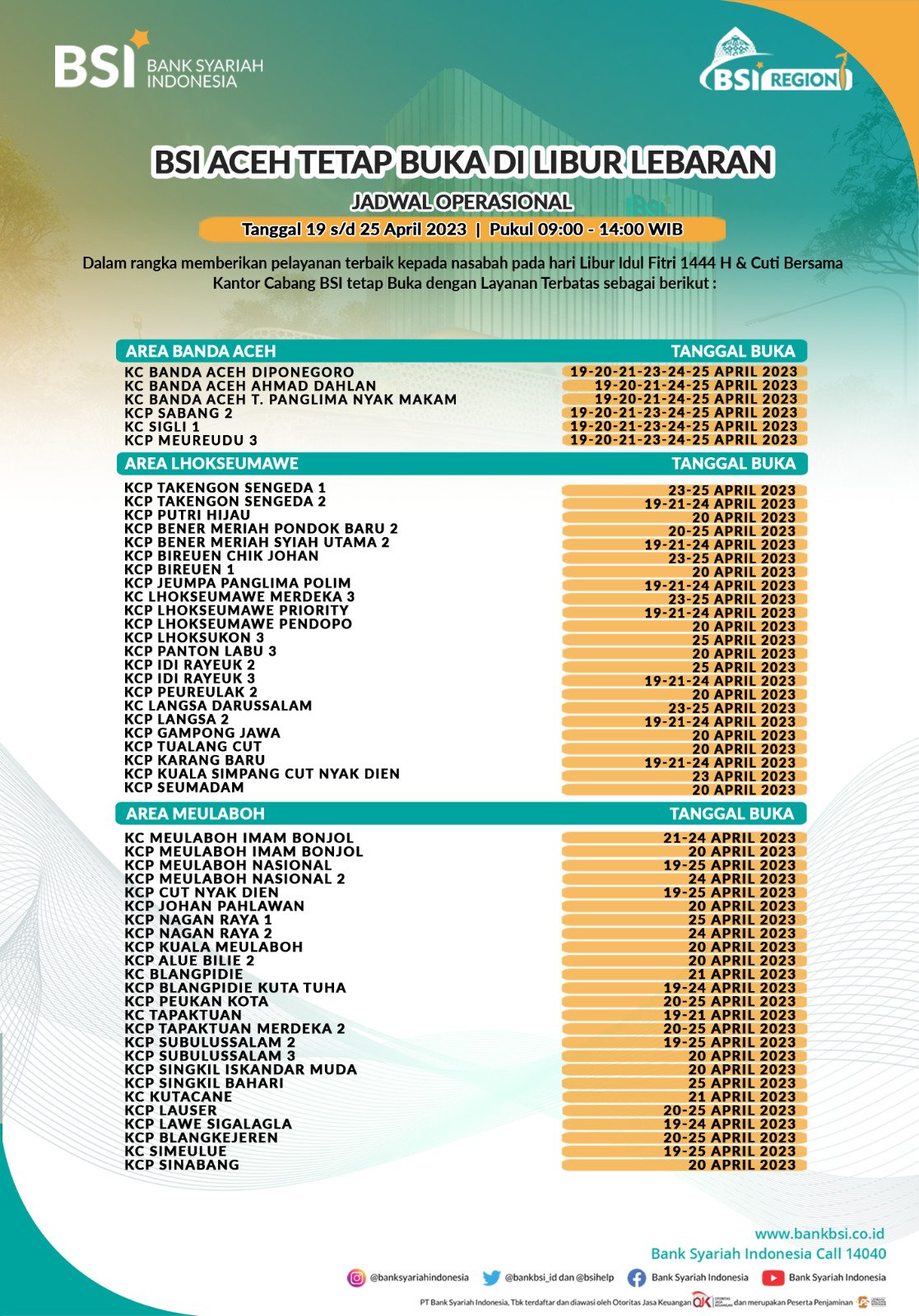 Adapun informasi kantor-kantor BSI yang akan beroperasi secara terbatas tersebut dapat diketahui melalui kanal website resmi BSI www.bankbsi.co.id dan sosial media BSI Region Aceh.