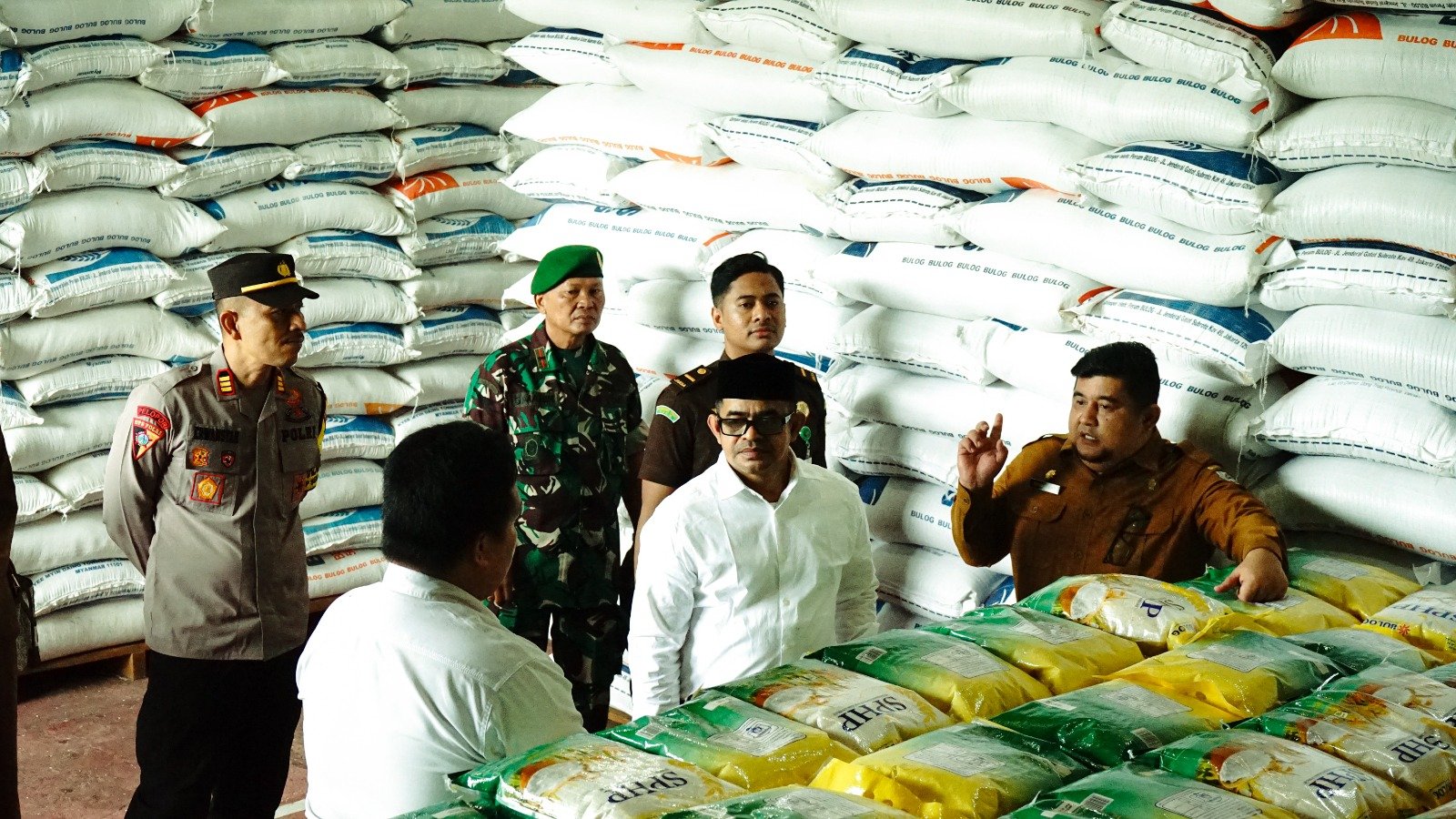 Usai memantau kegiatan pasar murah, PJ Bupati bersama rombongan melanjutkan kunjungan ke gudang Perum Bulog untuk melihat stok beras yang tersedia.