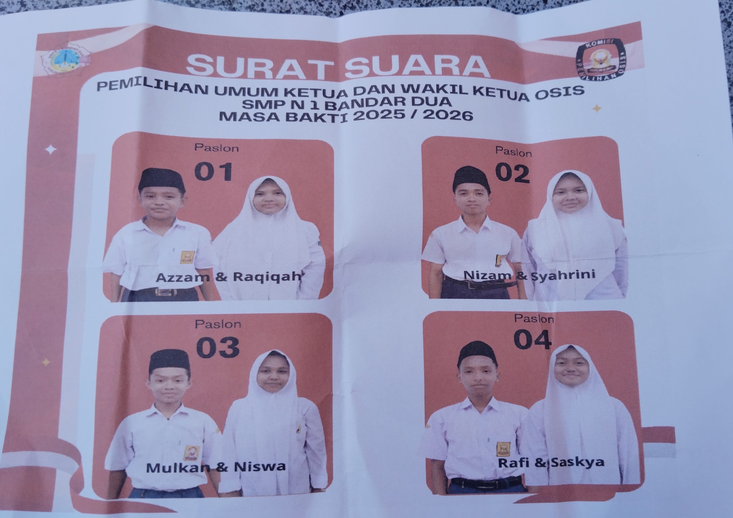 “Kami ingin perubahan di OSIS, terutama soal kedisiplinan. Makanya kami yakin Mulkan – Niswa bisa jadi pemimpin baru yang tegas dan peduli,” ucapnya.