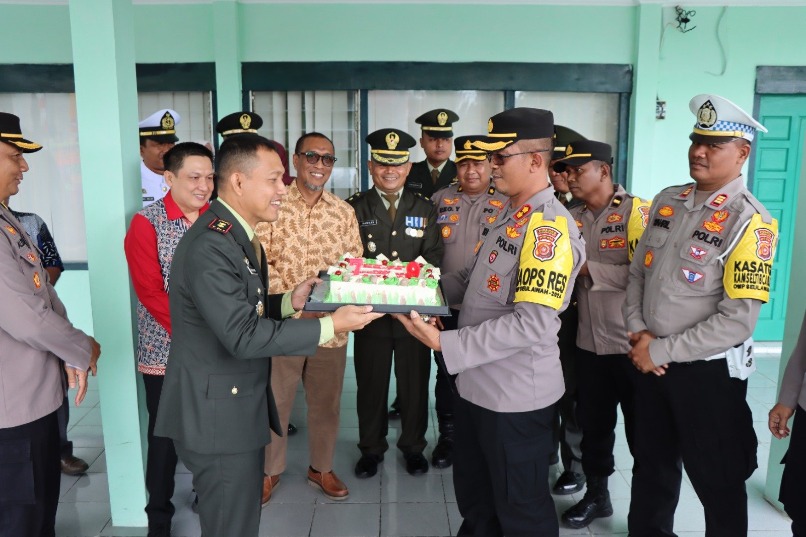 Kapolres menyampaikan ucapan selamat dengan penuh kehangatan dan simbol persaudaraan dengan diiringi musik dan menyanyikan lagu Selamat ulang Tahun secara bersama-sama menciptakan suasana menjadi lebih akrab dan meriah.