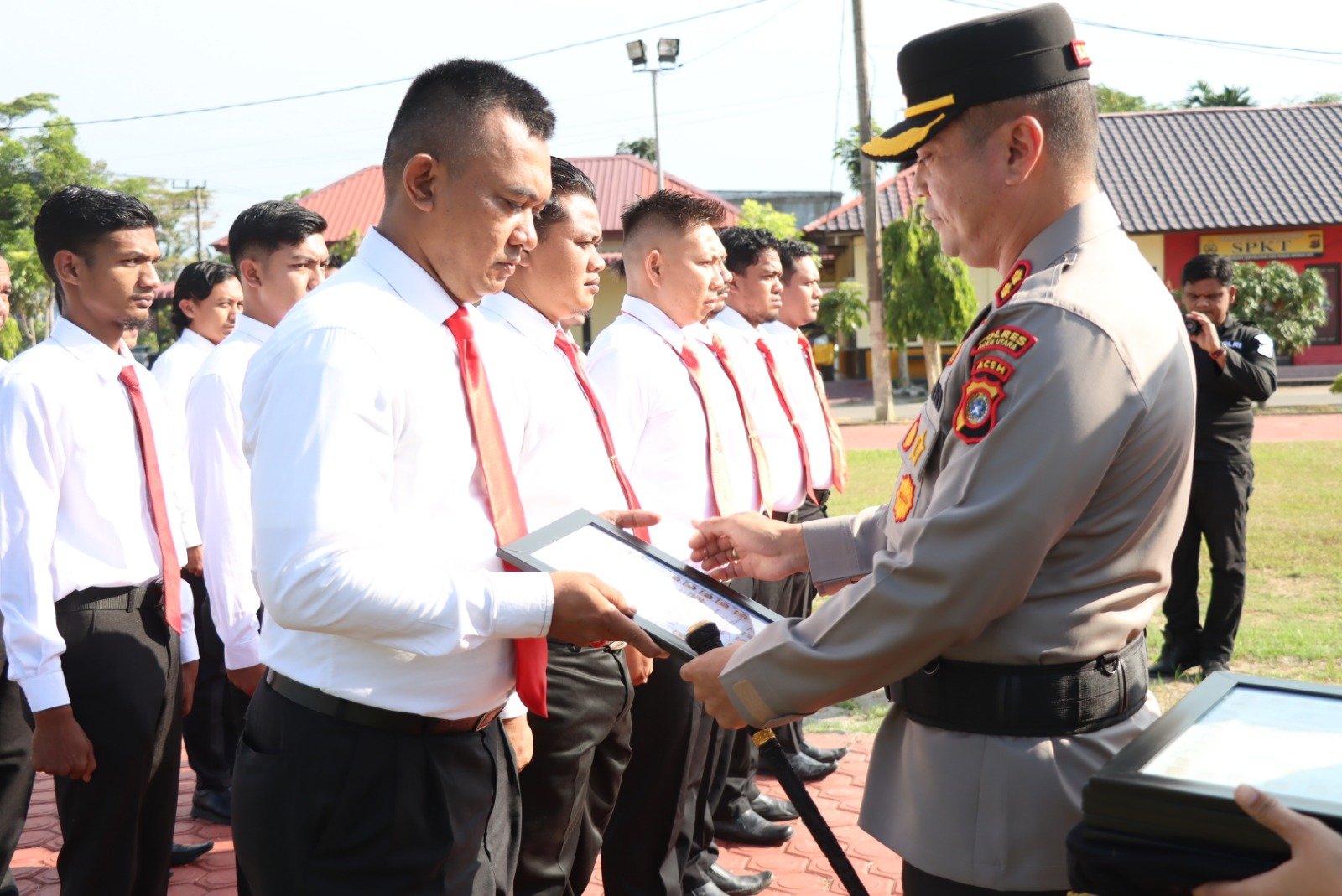 LENSAPOST.NET- Kapolres Aceh Utara AKBP Deden Heksaputera memberikan penghargaan atau reward kepada 19 personel berprestasi. Reward tersebut diterima 6 personel Reskrim dan 13 personel Resnarkoba dalam upacara di halaman Mapolres Aceh Utara, Selasa, 4 April 2023.