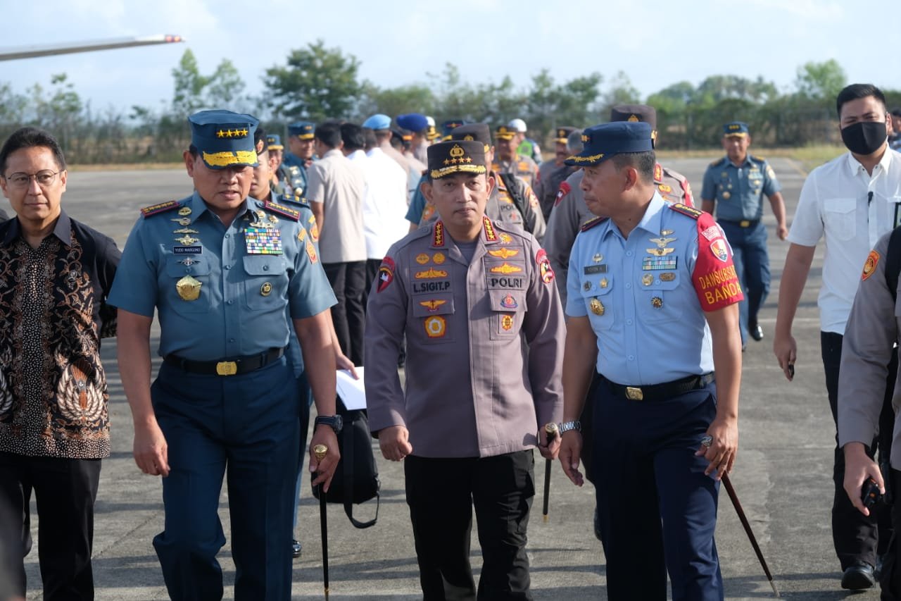 LENSAPOST.NET – Kapolri Jenderal Listyo Sigit Prabowo dan Panglima TNI Laksamana Yudo Margono tiba di Bandara Sultan Iskandar Muda (SIM) Blang Bintang, Aceh Besar. Kedatangan pimpinan TNI dan Polri itu disambut Kapolda Aceh Irjen Ahmad Haydar, Selasa, 27 Juni 2023.