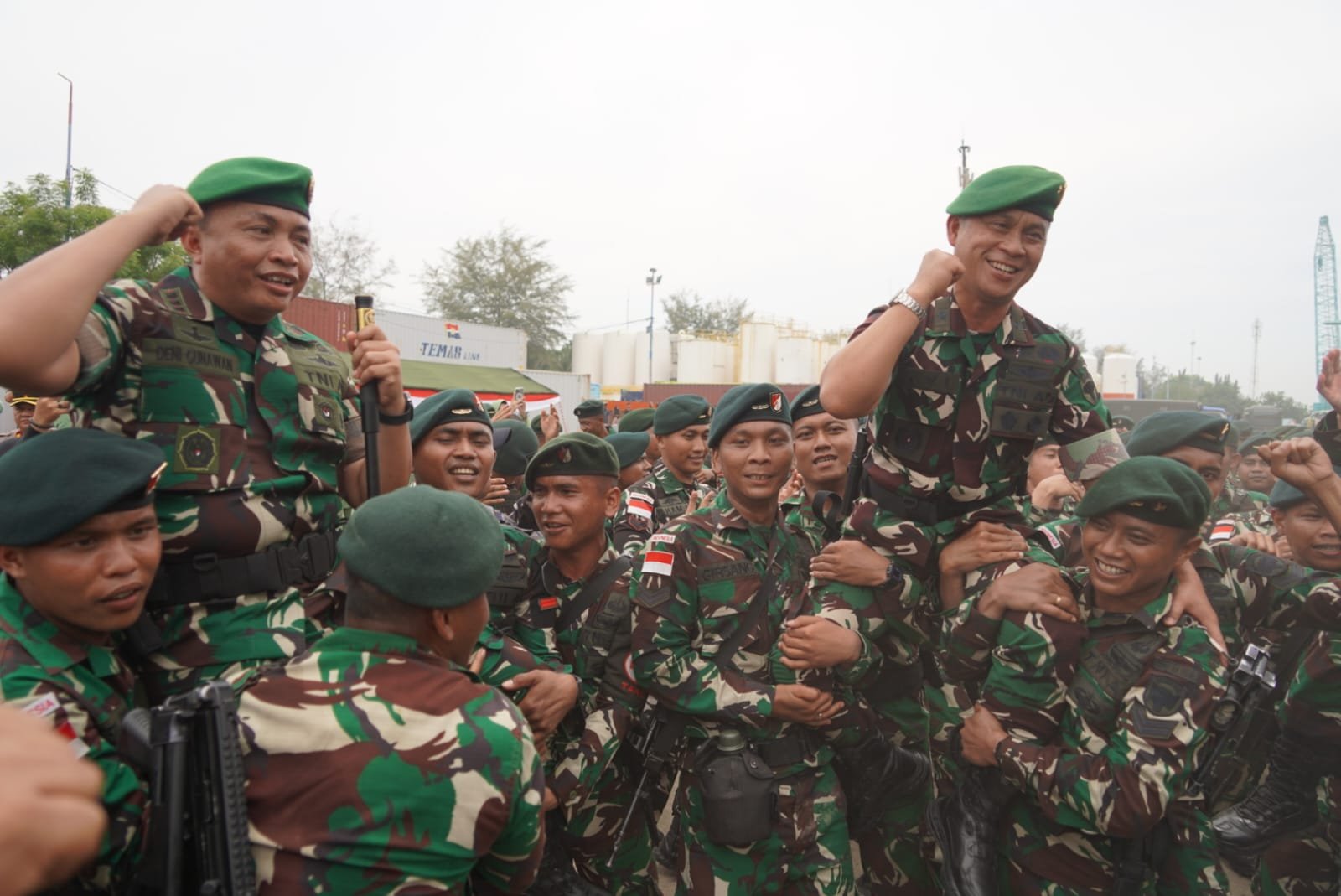 Para prajurit Yonif 115/ML tiba kembali di Provinsi Aceh melalui Pelabuhan Kreung Geukueh, Kota Lhokseumawe, menggunakan KRI Teluk Calang 524, yang mengangkut 450 personel di bawah pimpinan Komandan Satgas (Dansatgas), Letkol Inf Raden Herman Sasmita.