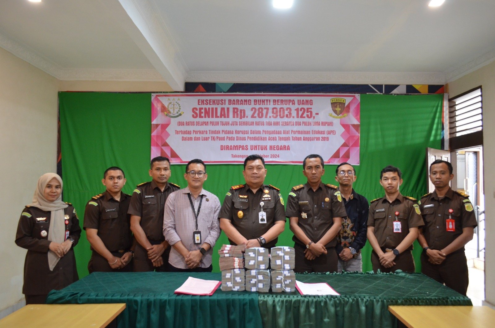 LENSAPOST.NET – Kejaksaan Negeri Aceh Tengah melakukan eksekusi terhadap barang bukti dalam kasus tindak pidana korupsi yang terkait dengan pengadaan alat permainan edukasi (APE) di TK/PAUD oleh Dinas Pendidikan Aceh Tengah tahun 2019, Selasa 8 Oktober 2024.