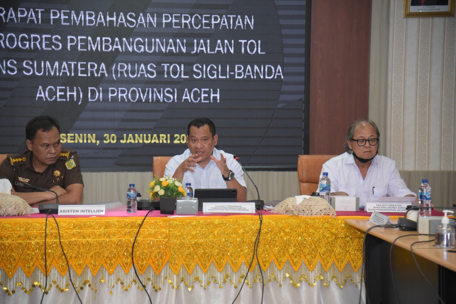 Dalam kesempatan sama, Kepala Kejati Aceh yang diwakili Asisten Intelijen Kejati Aceh, Mohamad Rohmadi, S.H.,M.H. menyampaikan rapat percepatan progress pekerjaan pembangunan Jalan Tol Sibanceh ini bertujuan untuk mencari solusi atas segala hambatan dan tantangan yang dapat mengganggu proses pelaksanaan pembangunan Jalan Tol tersebut.