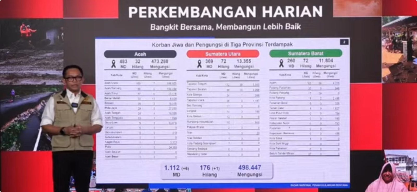 LENSAPOST.NET – Pemerintah terus mempercepat penanganan dampak hujan ekstrem yang memicu banjir dan longsor di tiga provinsi, yakni Aceh, Sumatra Utara, dan Sumatra Barat. Hingga Selasa (23/12/2025), jumlah korban meninggal dunia tercatat 1.112 jiwa, bertambah enam orang dibandingkan hari sebelumnya, sementara 176 warga masih dinyatakan hilang dan terus dilakukan pencarian oleh tim SAR gabungan.