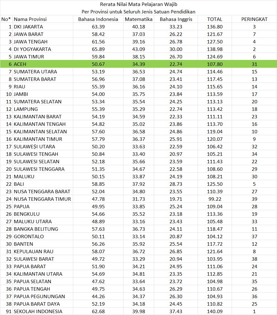 Dari data Posko TKA Disdik Aceh, rata-rata nilai siswa Aceh hanya mencapai 107,80, dengan rincian: Bahasa Indonesia 50,67; Matematika 34,39; dan Bahasa Inggris 22,74.