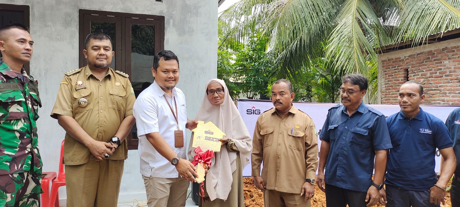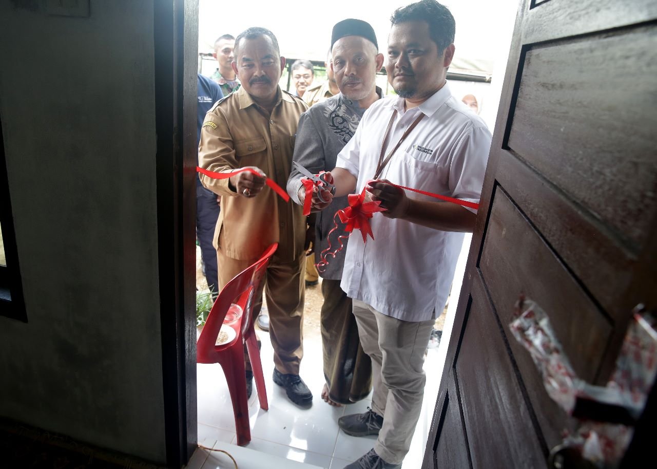Tafaul Rijal, GA & Comrel Manager SBA menyerahkan kunci rumah secara simbolis kepada Ibu Nurmala dan keluarga disaksikan oleh Asisten II Sekdakab Aceh Besar, M. Ali, S.Sos., M.Si., Anggota DPRK Kab. Aceh Besar, Abdul Muchti, Kadis PUPR Aceh Besar, Sekretaris Dinas Sosial Aceh Besar, Muspika Lhoknga, Geuchik dan tokoh masyarakat Lampaya.