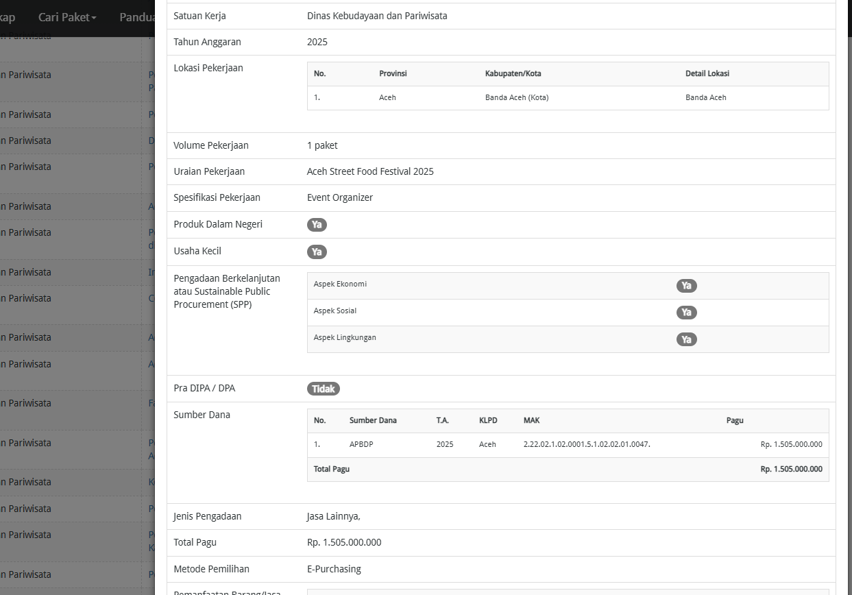 Menurut dokumen RUP, paket ini akan menggunakan metode e-purchasing dan bersumber dari APBD Perubahan Aceh tahun anggaran 2025 di bawah satuan kerja Disbudpar Aceh.