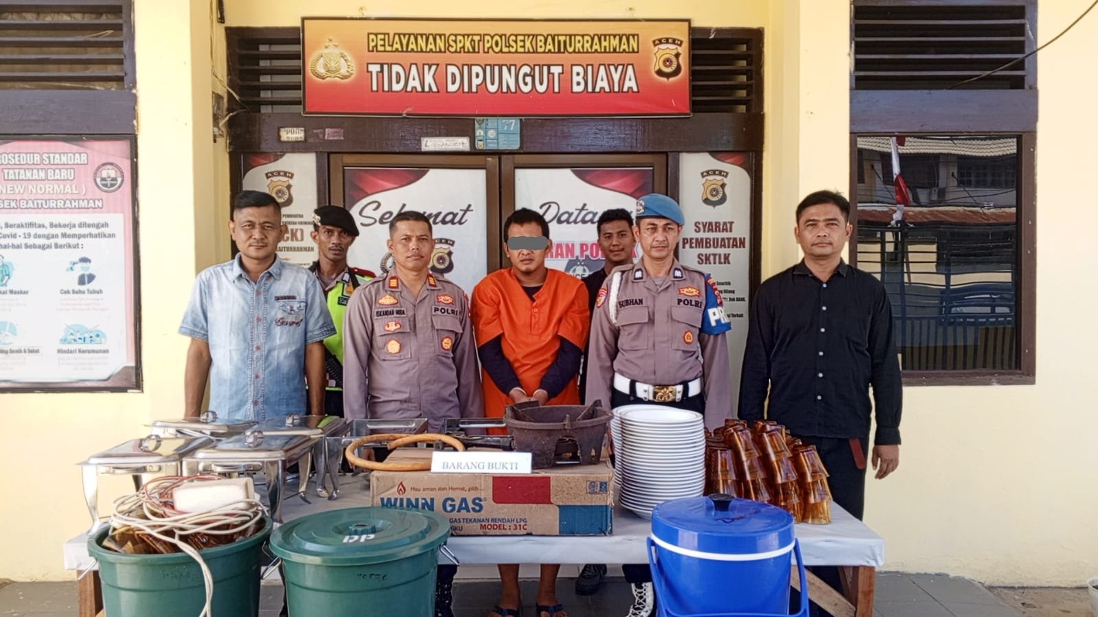 Dari penangkapan tersebut, pihak kepolisian mengamankan barang bukti berupa 5 lusin gelas duralek, 6 unit prasmanan, 5 lusin piring indokeramik, 1 unit kompor dan 2 ember warna hijau.