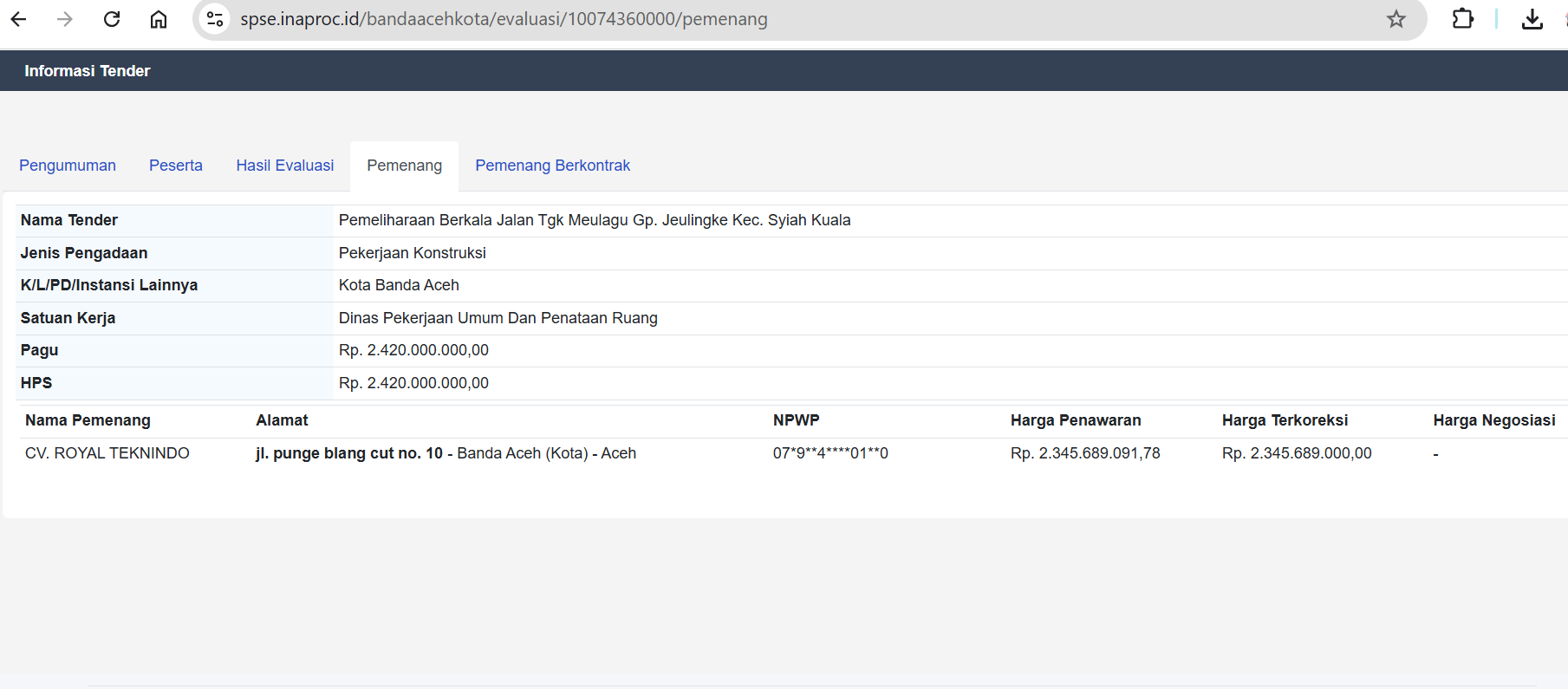 CV Royal Teknindo ditetapkan sebagai pemenang dengan nilai penawaran terkoreksi Rp 2.345.689.000. Perusahaan tersebut beralamat di Jl. Punge Blang Cut No. 10, Banda Aceh.