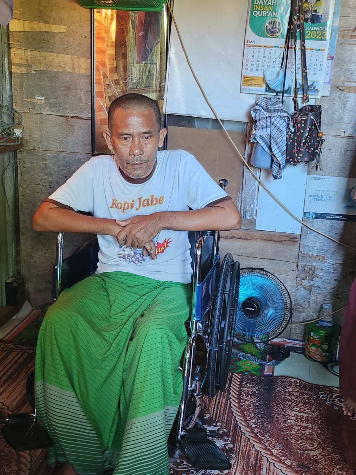 Pak Muliaman kesehariannya bekerja sebagai supir, sejak 6 bulan lalu mengalami lupuh tidak dapat bergerak dan berbicara. Ibu Rida juga dijadwal Selasa besok akan mengantarkan kursi roda untuk warga di Lhoong, Aceh Besar.[]
