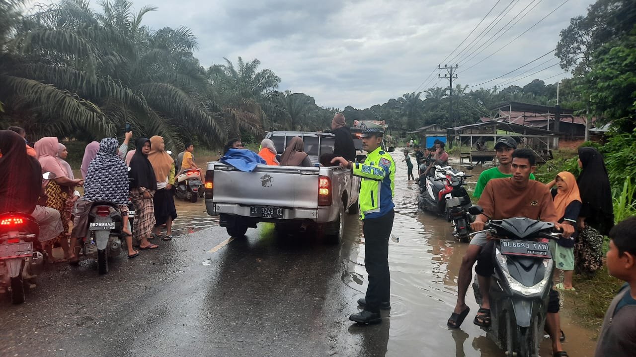 Petugas juga memberikan bantuan pertolongan kepada pengendara atau masyarakat yang hendak melintas dilokasi banjir.
