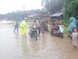 LENSAPOST. NET– Satuan Lalu Lintas (Sat Lantas) Polres Aceh Selatan Polda Aceh melakukan pengaturan lalu lintas di lokasi banjir Desa Ladang rimba Kecamatan Trumon Tengah Kabupaten Aceh Selatan.
