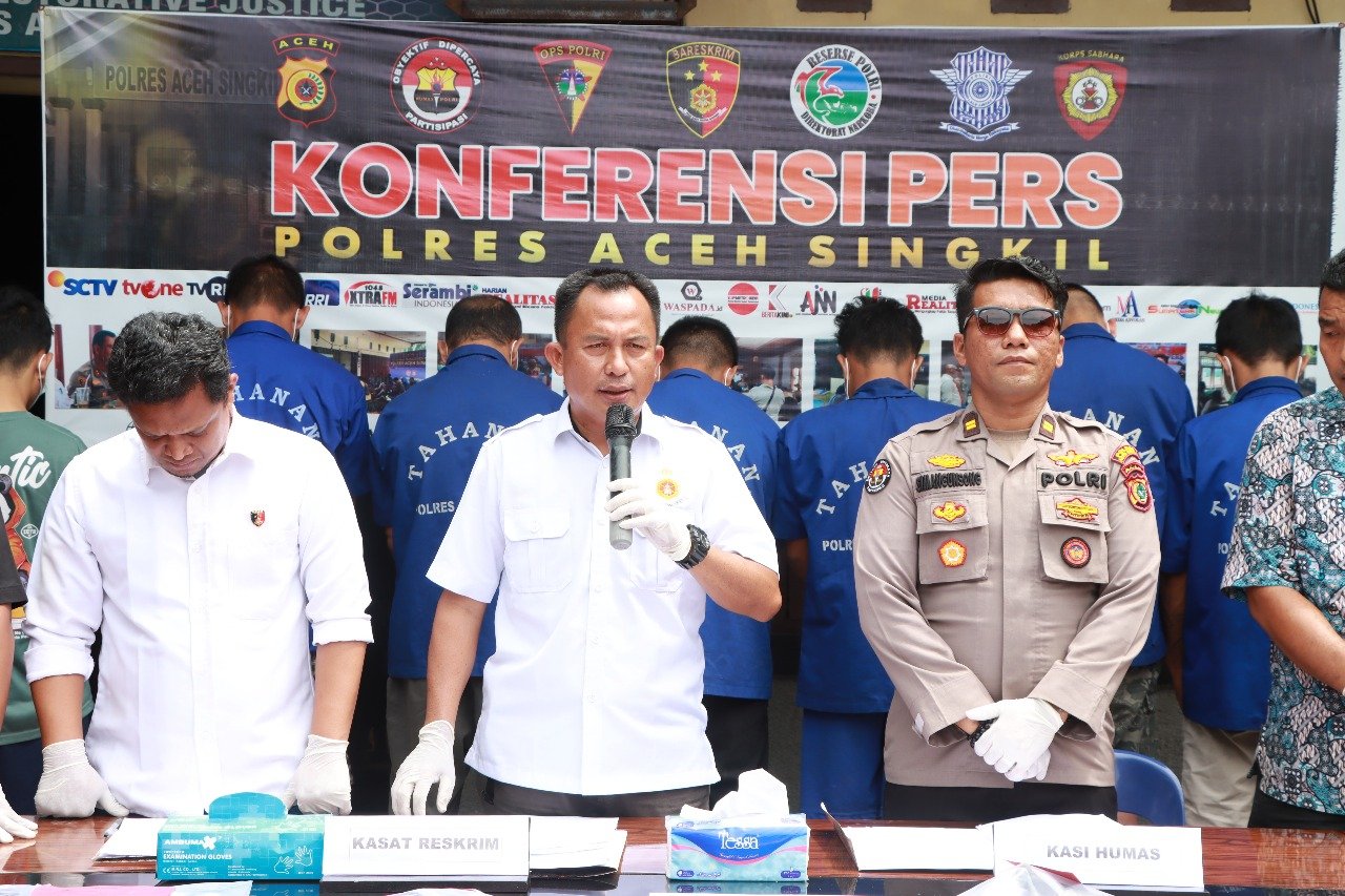 “Ada tiga kasus yang berhasil kami ungkap pada awal tahun 2025. Dari ketiga kasus tersebut, tujuh tersangka berhasil diamankan,” kata Kasat Reskrim Polres Aceh Singkil AKP Darmi Arianto Manik, yang didampingi Kasi Humas IPTU Eska Agustinus Simangunsong, dalam konferensi pers di Polres Aceh Singkil, Jumat, 21 Februari 2025.