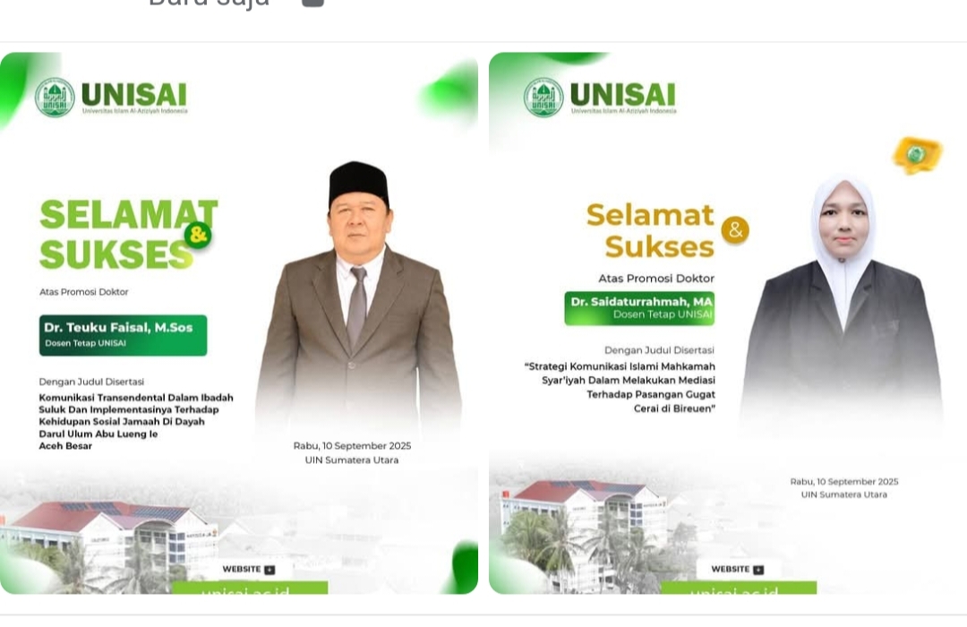 Capaian gemilang lahir dariUNISAI Samalanga. Dua dosen muda, Dr. Tgk. H.T. Faisal, M.Sos dan Dr. Saidaturrahmah, S.Sos.I., M.A., resmi meraih gelar doktor dalam sidang promosi terbuka di Universitas Islam Negeri Sumatera Utara (UINSU), Rabu (10/9).