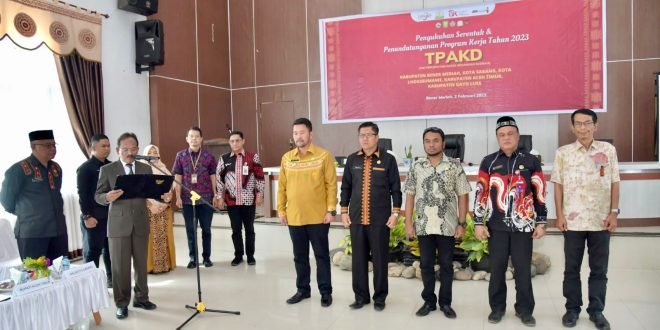 Penjabat (Pj) Gubernur Aceh yang diwakili Asisten II Sekda Aceh, Mawardi, saat mengukuhkan Tim Percepatan Akses Keuangan Daerah atau TPAKD di lima Kabupaten/Kota yaitu, Bener Meriah, Lhokseumawe, Sabang, Aceh Timur dan Gayo Lues sekaligus Penandatanganan Program Kerja Tahun 2023, di Bener Meriah, Kamis (2/2/2023).