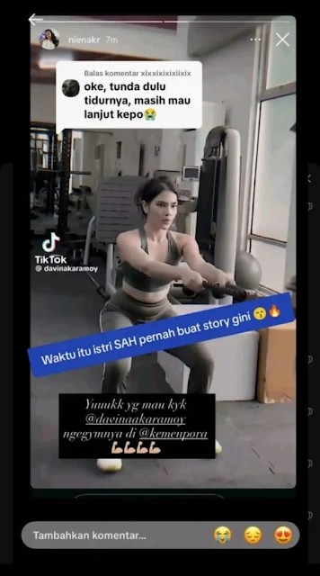 Tak hanya itu, Niena Kirana, istri sah Dito dikabarkan pernah ngespill hubungan suaminya dengan sang aktris. Lewat akun Instagram @nienakr, dia pernah membagikan screenshot konten TikTok Davina saat ngegym di Gedung Kemenpora.