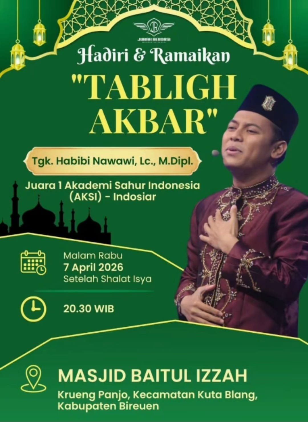 LENSAPOST.NET – Tgk Habibi Nawawi, Lc, M. Dipl, dai yang dikenal sebagai juara I Akademi Sahur Indonesia (AKSI) Indosiar, dijadwalkan mengisi Tablig Akbar di Masjid Baitul Izzah Krueng Panjoe, Kecamatan Kutablang, Kabupaten Bireuen.