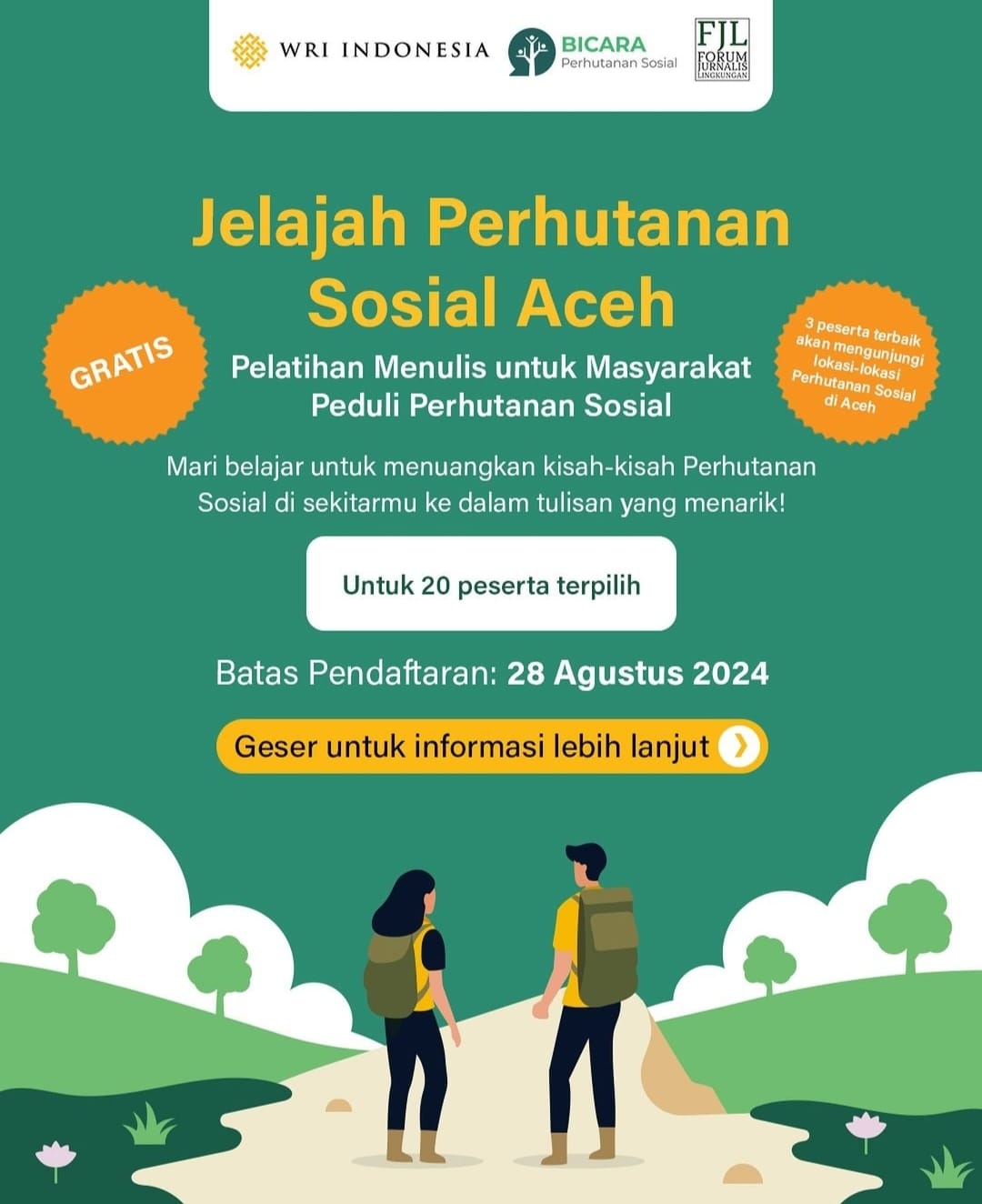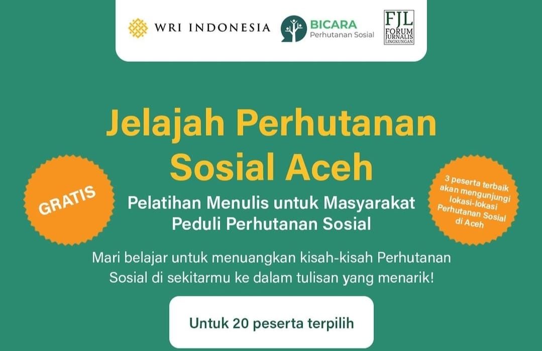 Dengan latar belakang tersebut, WRI Indonesia bermaksud menyelenggarakan kegiatan Bootcamp Jelajah Perhutanan Sosial Aceh dalam rangka Pembuatan Konten Tulisan tentang pengelolaan Perhutanan Sosial. Kegiatan ini berkolaborasi dengan Forum Jurnalis Lingkungan sebagai ahli dan praktisi dalam bidang pembuatan karya tulisan popular berupa konten tulisan.