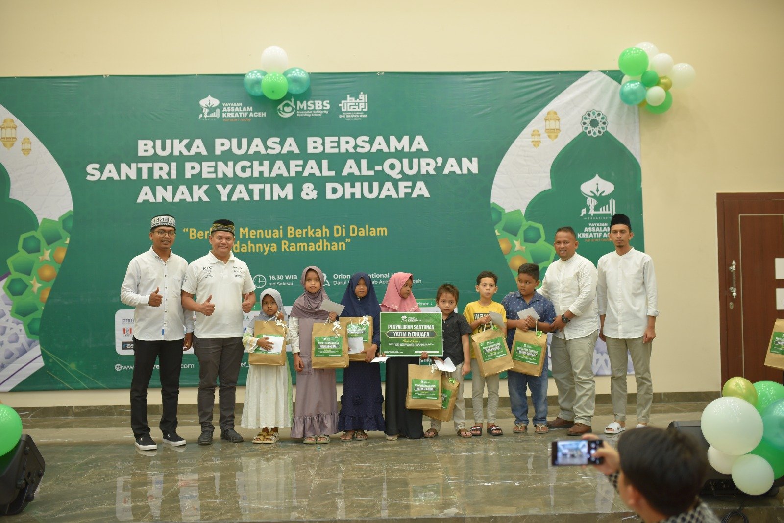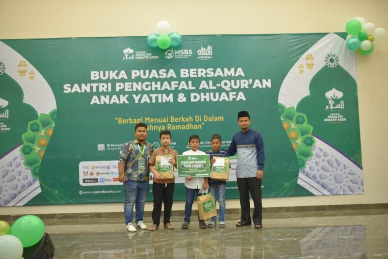 LENSAPOST.NET – Yayasan Assalam Kreatif Aceh menggelar acara berbuka puasa Ramadhan 1444 H bersama para penghafal Al Quran dan santunan kepada 30 orang anak yatim di Orion Convention Hall, Darul Imarah, Aceh Besar, Minggu, 9 April 2023.